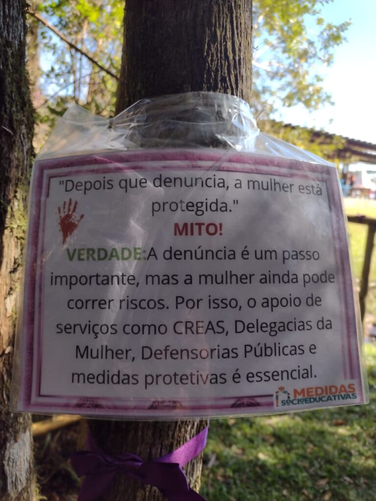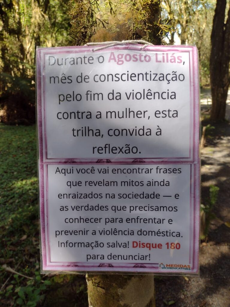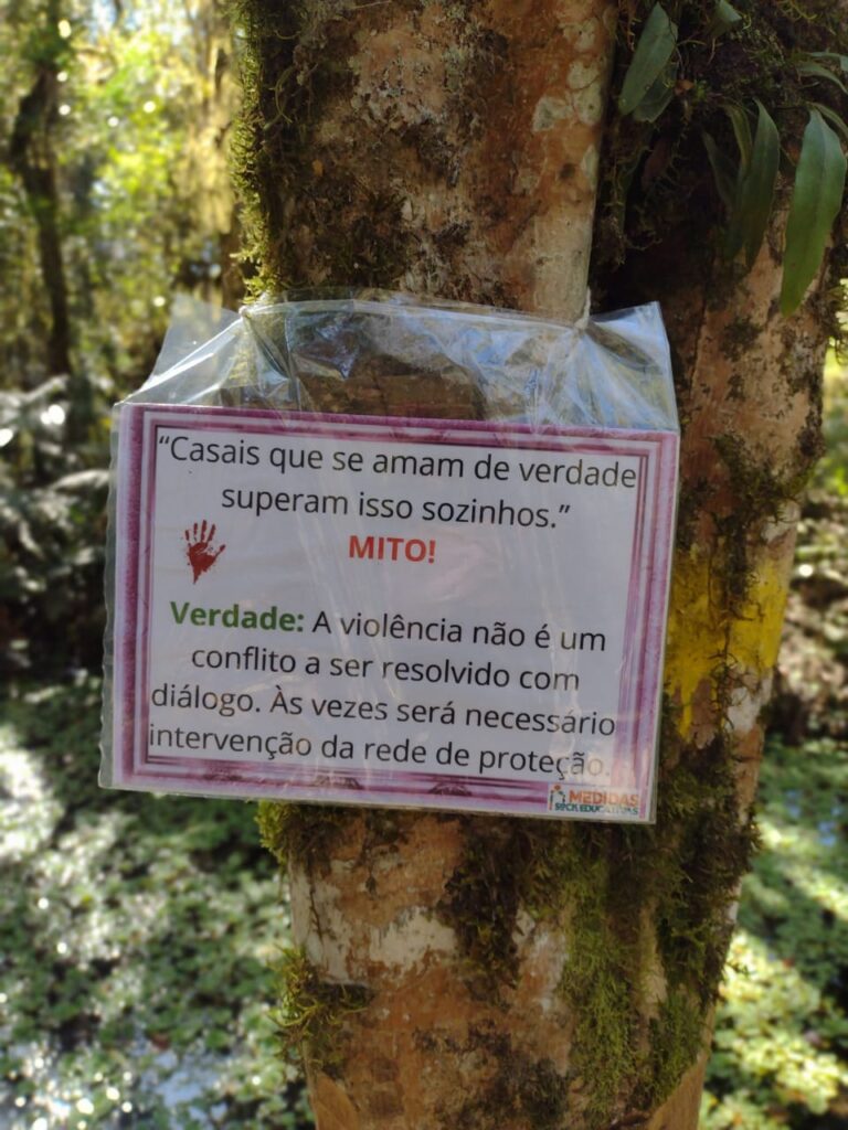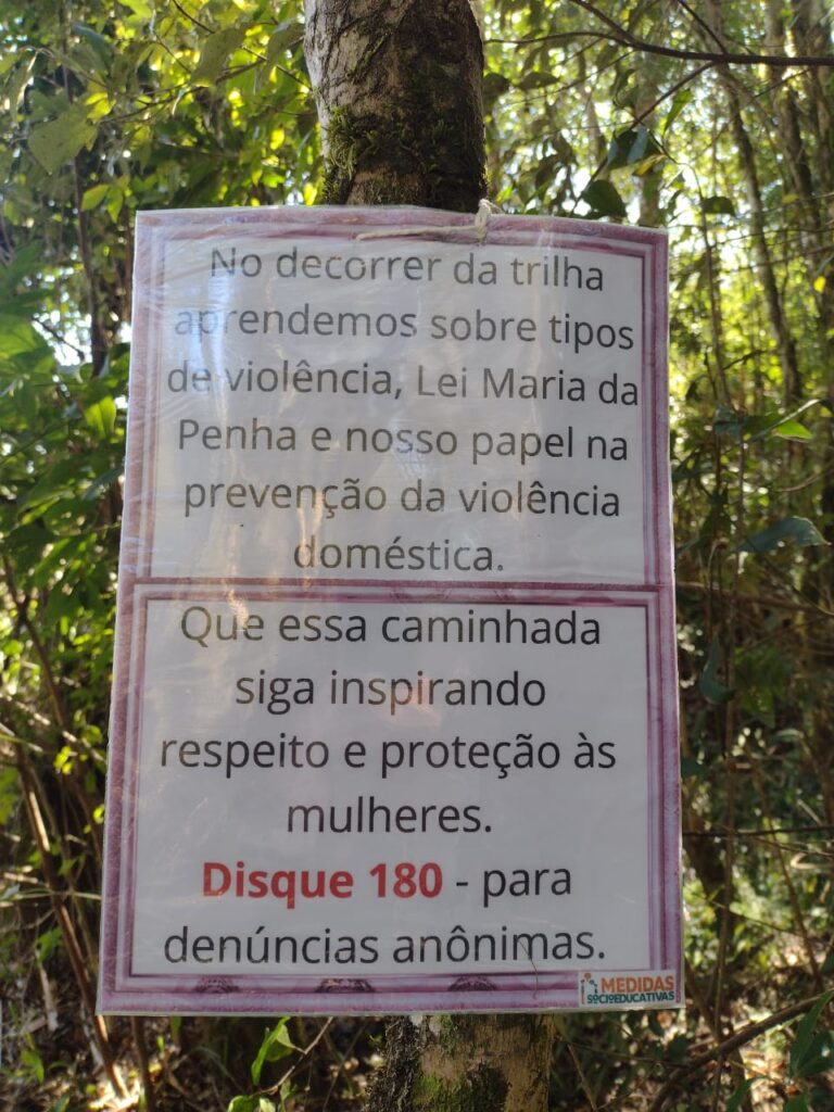 Adolescentes em cumprimento de Prestação de Serviço à Comunidade (PSC) confeccionaram placas com mitos e verdades sobre a violência doméstica, que agora estão espalhadas pela trilha do parque, criando um caminho de informação e reflexão para quem passa por ali.