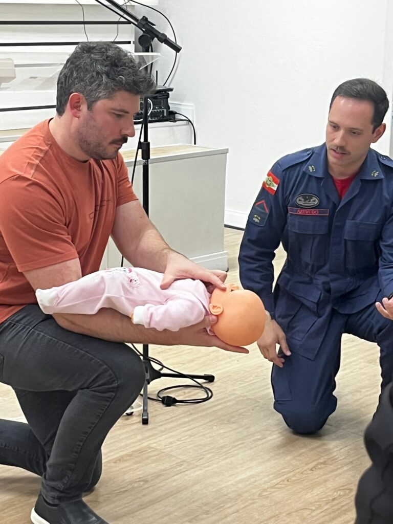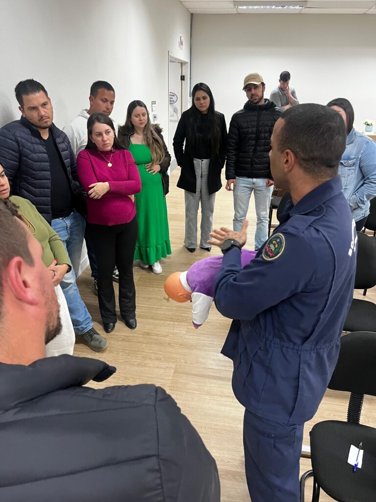 • Corpo de Bombeiros – apresentou técnicas de primeiros socorros e desobstrução de vias aéreas em bebês, ensinando procedimentos fundamentais em situações de emergência;