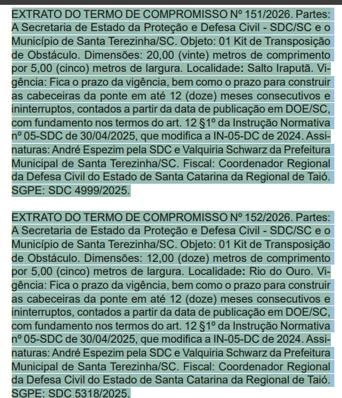 A construção da ponte já foi confirmada oficialmente e publicada no Diário Oficial de Santa Catarina, o que garante o avanço do processo e anima a administração municipal.