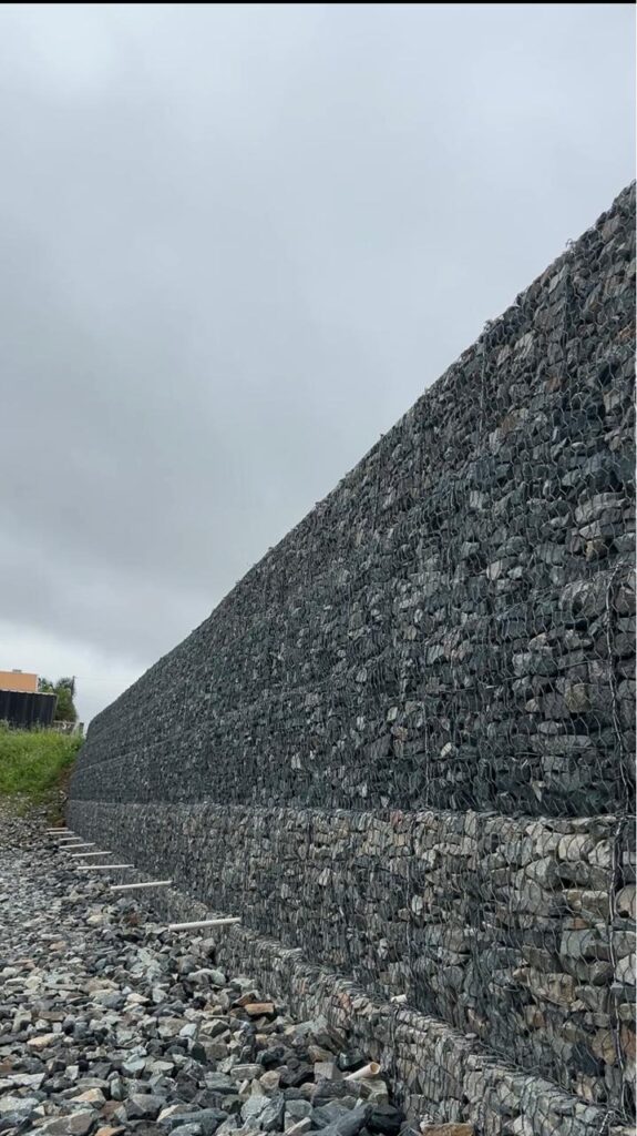 Para estabilizar a encosta, foi adotada uma solução de engenharia baseada na construção de uma estrutura de contenção do tipo gabião — formada por gaiolas metálicas preenchidas com pedras, que oferecem alta resistência e adaptabilidade ao terreno.
