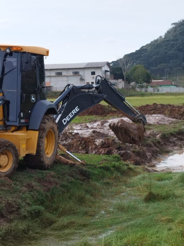 Na propriedade do senhor Euclides Schiessl da Estrada dona Francisca no bairro Bela Aliança, a retroescavadeira da Prefeitura foi utilizada para fazer a drenagem de uma área toda alagada, para que ela seja utilizada como pastagem para o gado de leite.
