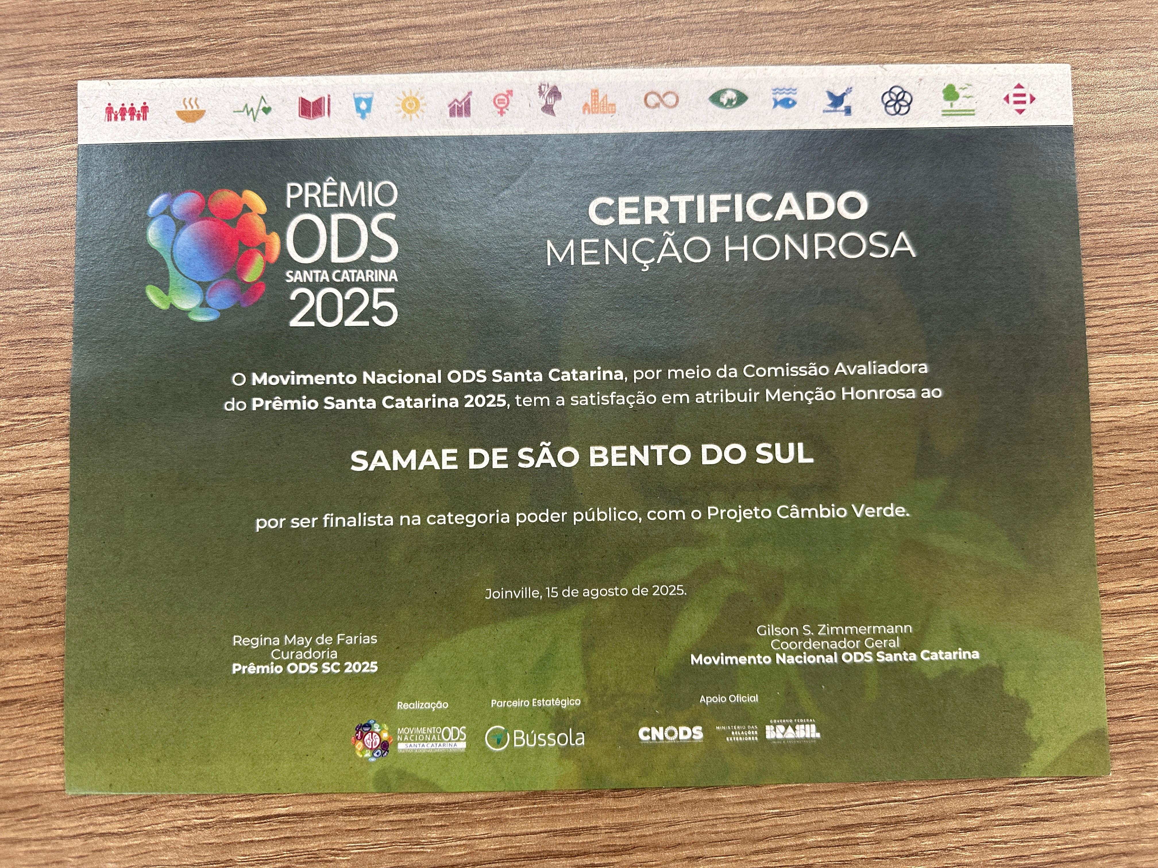 Na última sexta-feira (15), em Joinville, a Prefeitura de São Bento do Sul, por meio do Serviço Autônomo Municipal de Água e Esgoto (Samae), recebeu Menção Honrosa no Prêmio ODS Santa Catarina 2025 pelo projeto “Câmbio Verde”, na categoria Poder Público. A entrega ocorreu durante o Fórum Brasil ODS, evento que reuniu gestores, especialistas e representantes de diversas regiões do país em prol dos Objetivos de Desenvolvimento Sustentável (ODS) da ONU.