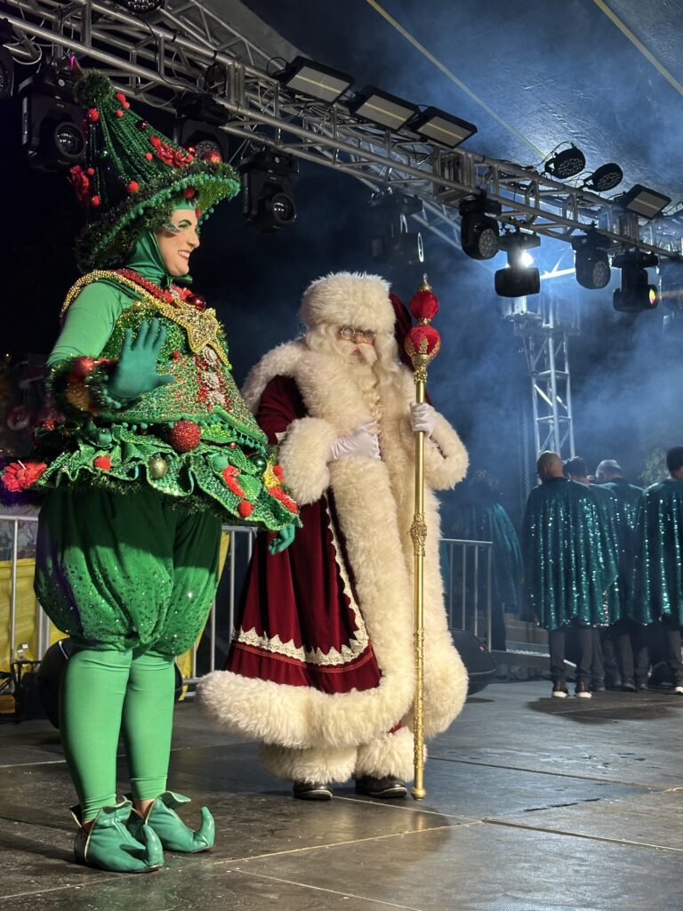 O momento mais aguardado da noite não decepcionou: o Papai Noel chegou à praça trazendo alegria, encantando as crianças e reacendendo a magia do Natal por toda a cidade.