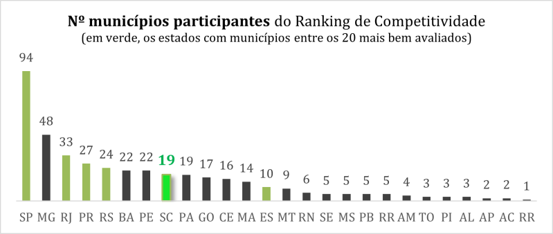 Santa Catarina tem a maior proporção de cidades entre as mais bem avaliadas do Ranking de Competitividade dos Municípios. Dos 19 municípios catarinenses que participaram, quatro garantiram posições entre os 20 primeiros colocados.