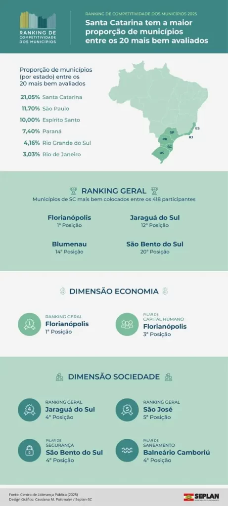 Além disso, nessa última edição de 2025, o município de Florianópolis manteve sua liderança, sendo mais uma vez avaliado como o mais competitivo entre os 418 participantes. Já no Ranking de Competitividade dos Estados, o estado de Santa Catarina manteve-se também no topo, conquistando o segundo lugar, atrás apenas de São Paulo.