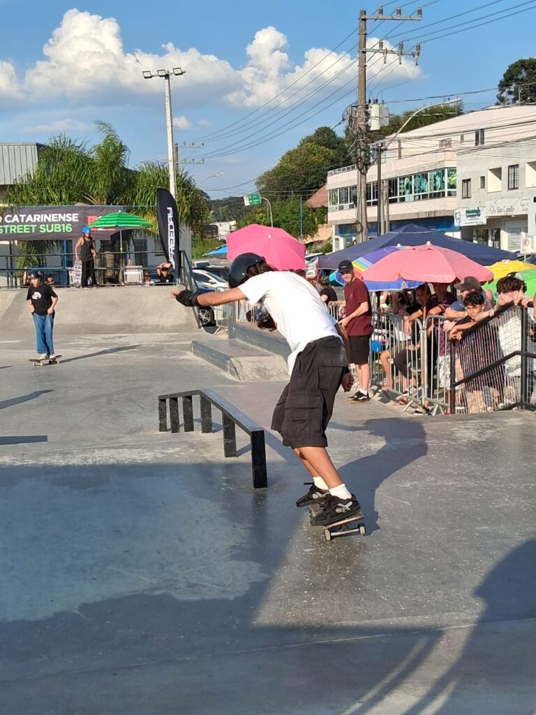 Com o apoio da Fundação Municipal de Desportos (FMD) e da Associação de Skate de São Bento do Sul (ASSB), a pista da Praça Céu das Artes, em Serra Alta, foi palco no último fim de semana da etapa final do Circuito Catarinense de Skate Street – SC Tricks Sub-16. O evento reuniu atletas de diversas cidades e marcou o encerramento da temporada 2025 da Federação Catarinense de Skate (FCSKT).