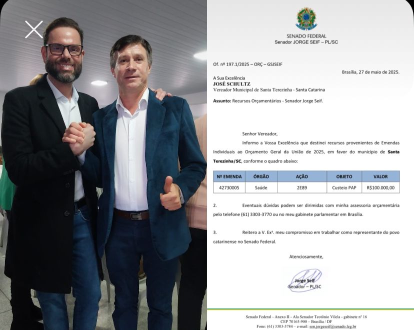 Além disso, Pascoal também viabilizou uma emenda do senador Jorge Seif (PL), no valor de R$ 100 mil, destinada ao custeio da manutenção da saúde municipal. O apoio foi conquistado após uma conversa direta em Brasília, onde o vereador apresentou as necessidades da rede de saúde de Santa Terezinha.